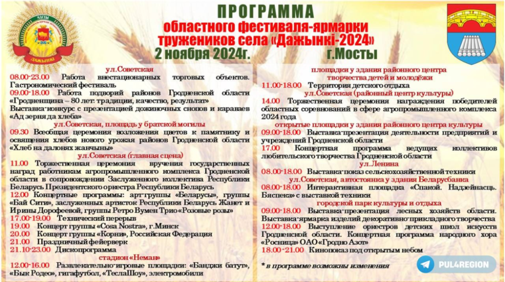 Подворье Лидского региона покажет, как добывался хлеб в послевоенный период 1943-1955 годов. Волковычане посвятят площадку становлению градообразующего предприятия в 1956-1965 годах – ОАО «Волковысский мясокомбинат», которому исполняется 60 лет. На подворье Свислочского района продемонстрируют эволюцию брендового мероприятия – каравай-феста «Бацькава булка». Островецкий край покажет достижения в молочной отрасли за 2019–2024 годы.