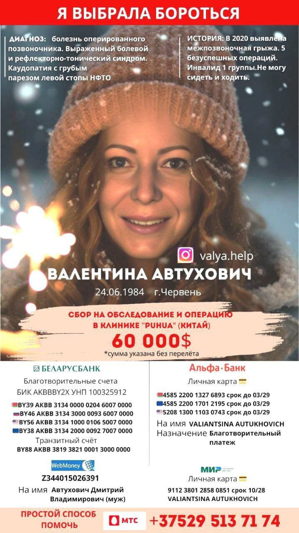 С 2020 г. по 2021 г. она перенесла пять операций на пояснично-крестцовом отделе позвоночника. Четыре операции были проведены в УЗ «Минская областная клиническая больница», пятую проводили в ГУ «РНПЦ неврологии и нейрохирургии». К сожалению, операции и реабилитации не дали положительных результатов, и на сегодняшний день, Валентина является инвалидом 1 группы. Международная клиника «Пухуа» в Китае согласна взять на обследование, лечение и операцию, стоимость которой стоит 60.000 долларов (без перелета). Для семьи эта огромная сумма и без посторонней помощи не справиться.